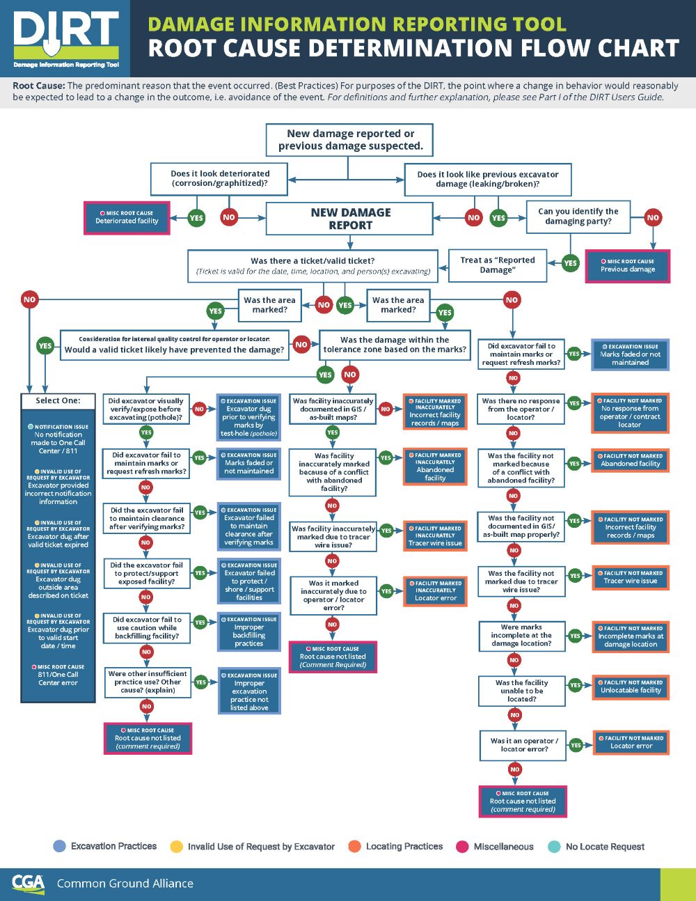 The Common Ground Alliance (CGA) Root Cause Flow Chart is a standardized tool designed to help identify and classify the root causes of damage incidents when reporting through the Damage Information Reporting Tool (DIRT). This flow chart provides a systematic approach to analyzing damage events, helping to ensure consistent and accurate root cause classification across the industry.